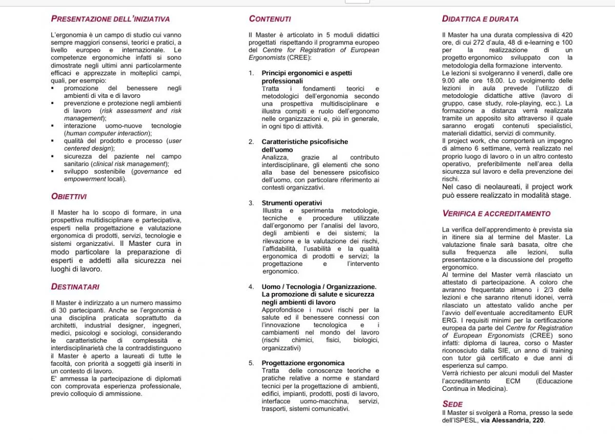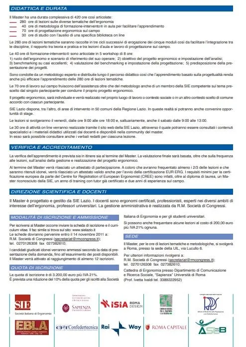 Il Master ha una durata complessiva di 520 ore così articolate:- 320 ore di lezione sulle fondamentali tematiche dell’ergonomia